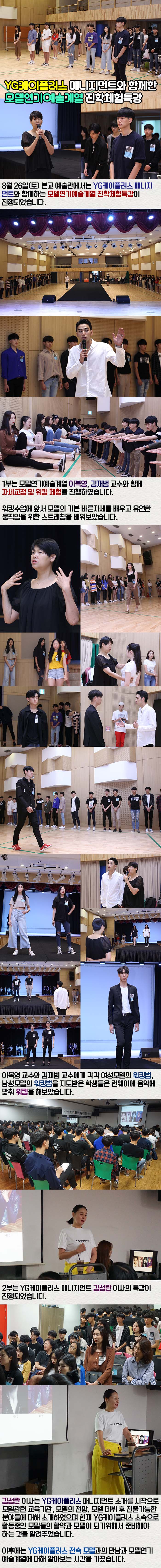8월 26일(토) 본교 예술관에서는 YG케이플러스 매니지먼트와 함께하는 모델연기예술계열 진학체험특강이 진행되었습니다.