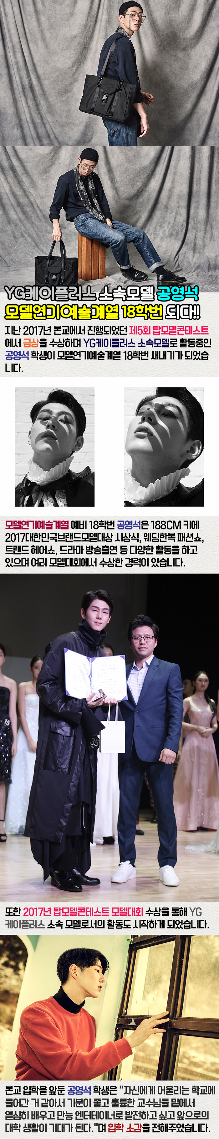 지난 2017년 본교에서 진행되었던 제5회 탑모델콘테스트에서 금상을 수상하며 YG케이플러스 소속모델로 활동중인 공영석 학생이 모델연기예술계열 18학번 새내기가 되었습니다.