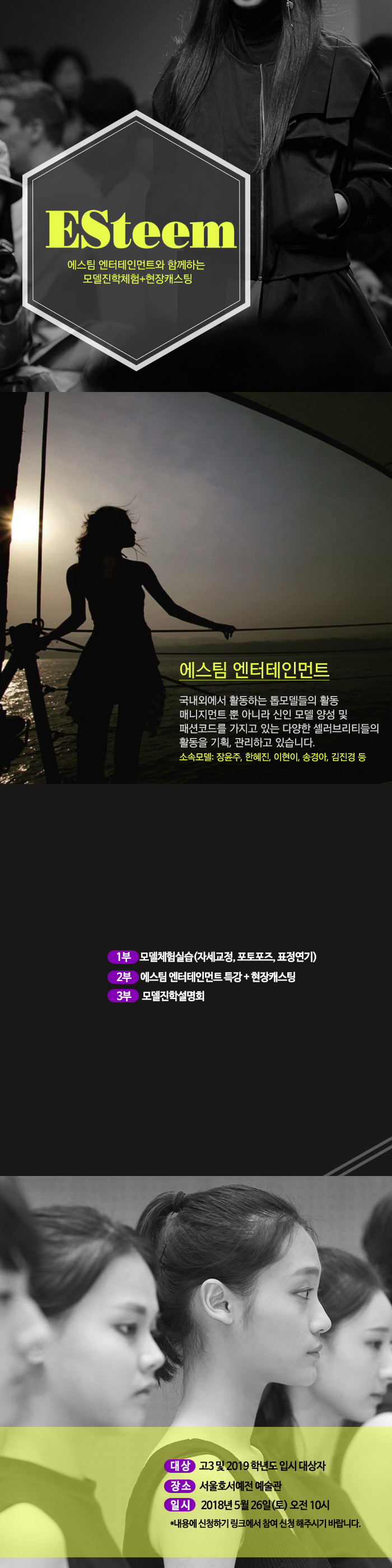 에스팀 엔터테인먼트와 함께하는 무료모델체험+현장캐스팅이 오는 5월 26일(토) 오전10시에 아래와 같이 진행됩니다.