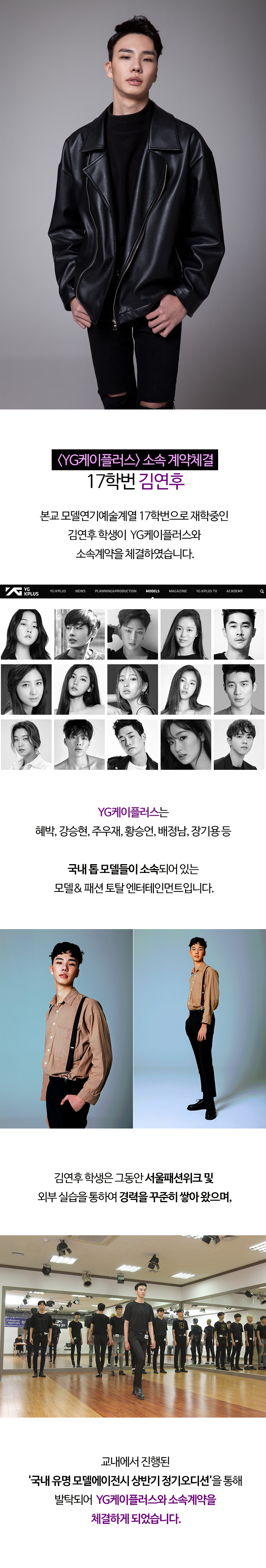 본교 모델연기예술계열 17학번으로 재학중인 김연후 학생이 YG케이플러스와 소속계약을 체결하였습니다.