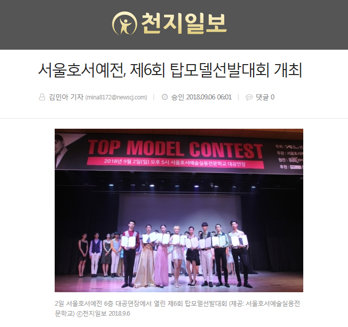 서울호서예술실용전문학교(서울호서예전)가 주관하고, YG케이플러스와 백지애웨딩이 주최, 오란씨·칼로바이·아뜰리에뷰티아카데미가 협찬, 한국모델협회가 후원한 제6회 탑모델선발대회가 지난 2일 서울호서예전 6층 대공연장에서 개최됐다.