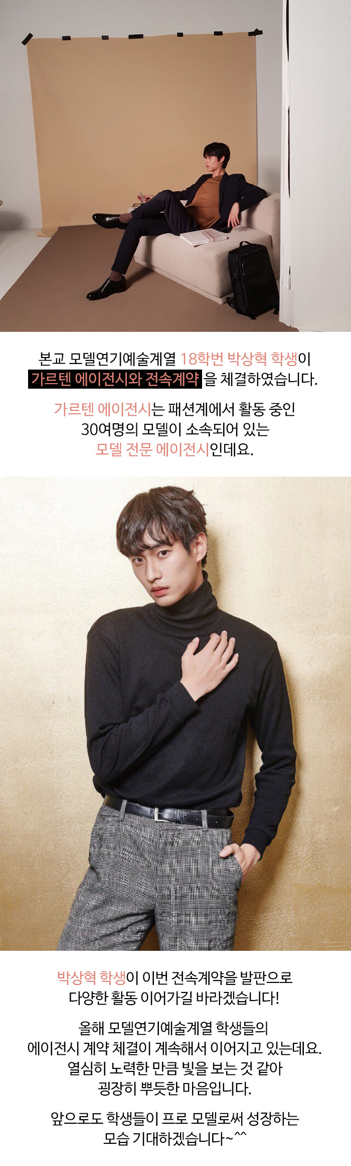 본교 모델연기예술계열 18학번 박상혁학생이 가르텐 에이전시와 전속계약을 체결하였습니다.