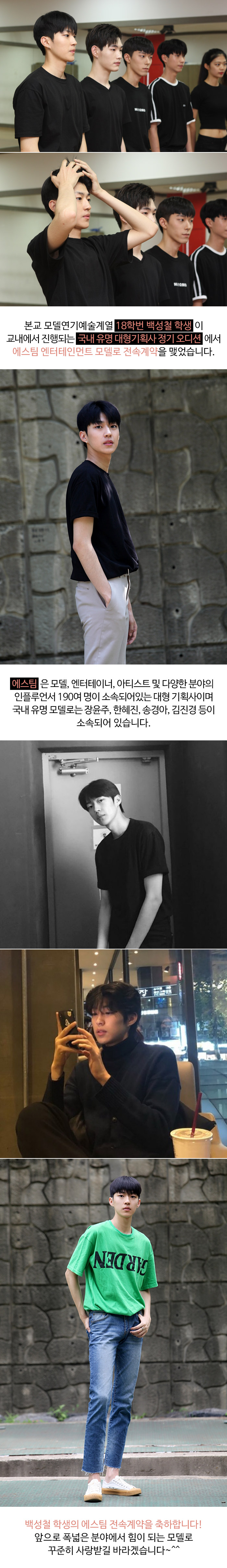 본교 모델연기예술계열 18학번 백성철 학생이 교내에서 진행되는 국내 유명 대형기획사 정기 오디션에서 에스팀 엔터테인먼트 모델로 전속계약을 맺었습니다.