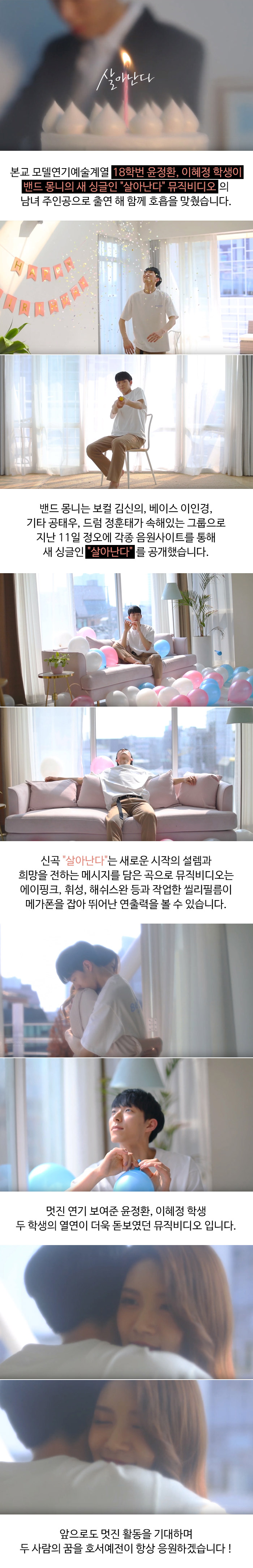 본교 모델연기예술계열 18학번 윤정환, 이혜정 학생이 밴드 몽니의 새 싱글인 "살아난다" 뮤직비디오의 남녀 주인공으로 출연해 함께 호흡을 맞췄습니다.