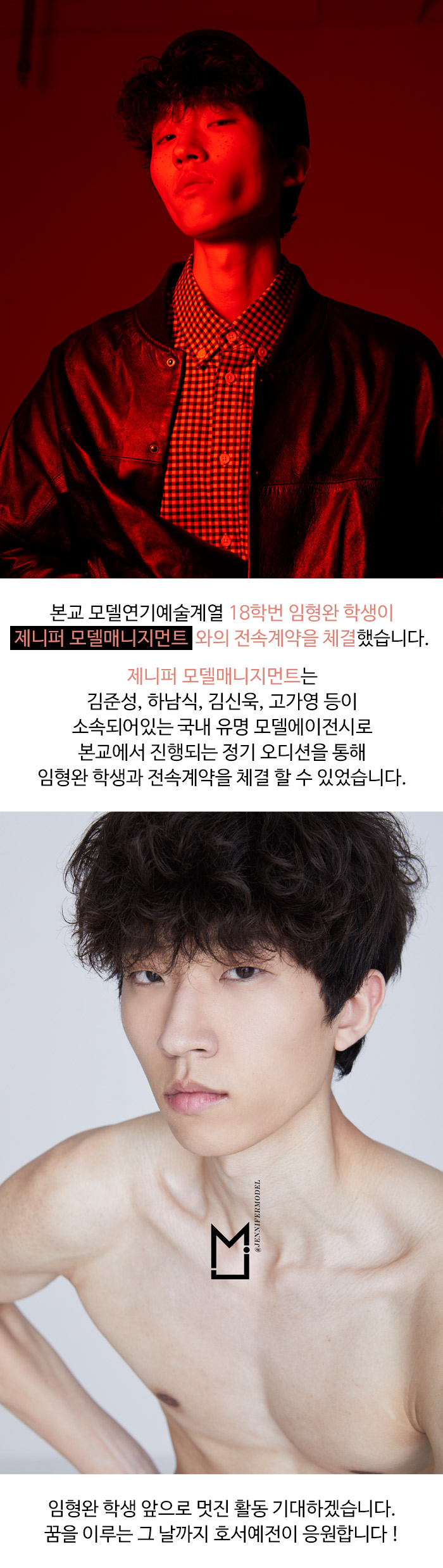 본교 모델연기예술계열 18학번 임형완 학생이 제니퍼 모델매니지먼트와의 전속계약을 체결했습니다.
