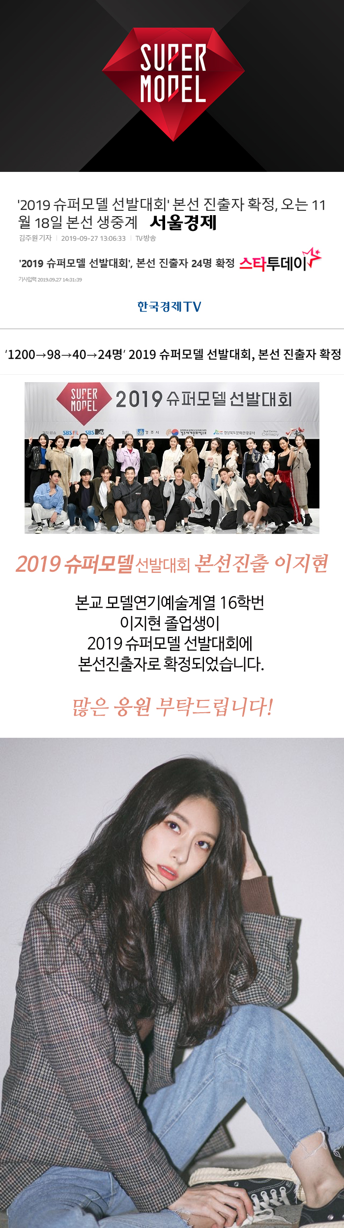 본교 모델연기예술계열 16학번 이지현 졸업생이 2019 슈퍼모델 선발대회에 본선진출자로 확정되었습니다.