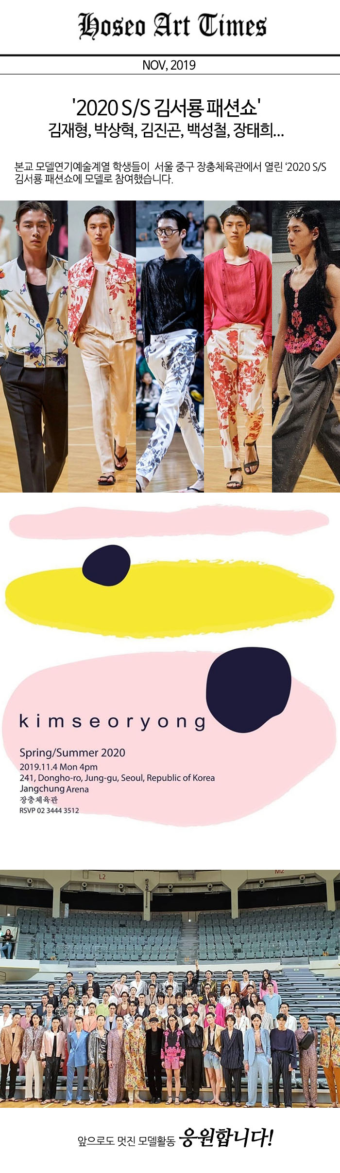 김재형, 박상혁, 김진곤, 백성철, 장태희 졸업생 및 재학생들이 김서룡 패션쇼에 참여하였습니다.
