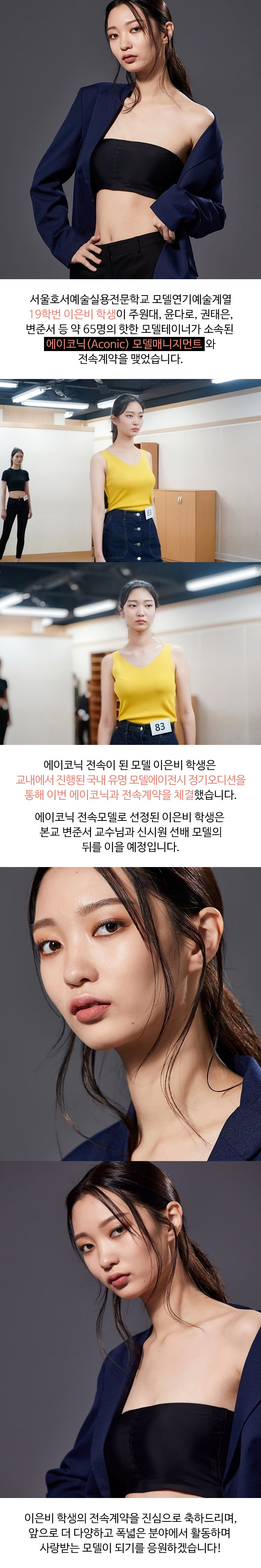 서울호서예술실용전문학교 모델연기예술계열 19학번 이은비 학생이 주원대, 윤다로, 권태은, 변준서 등 약 65명의 핫한 모델테이너가 소속된 에이코닉(Aconic) 모델매니지먼트와 전속계약을 맺었습니다.