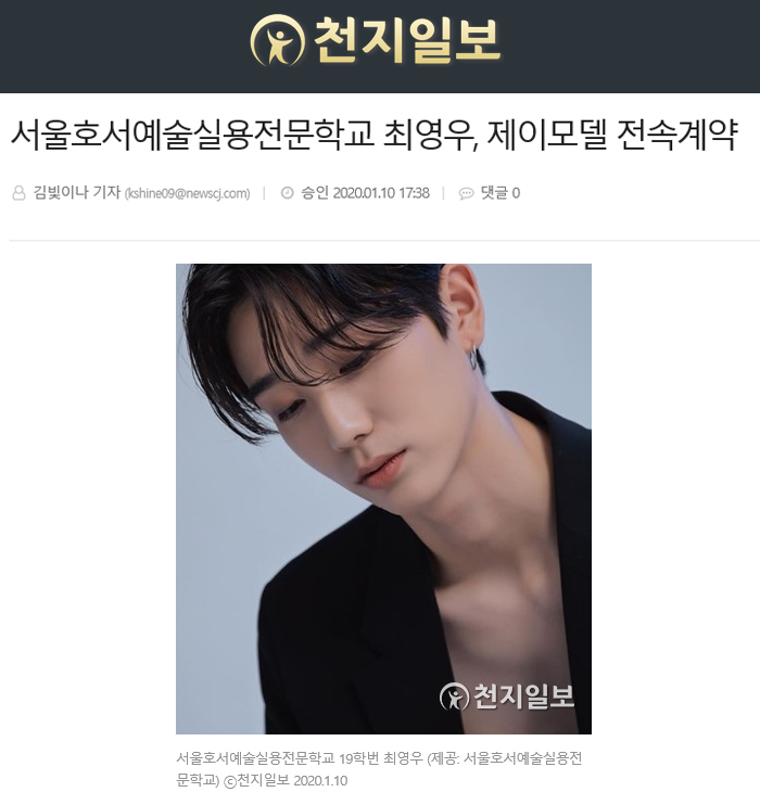 서울호서예술실용전문학교(서울호서예전) 모델연기예술계열 19학번 최영우 학생이 해외모델, 국내모델의 모델매니지먼트 제이모델(jmodel)과 전속계약을 맺었다.