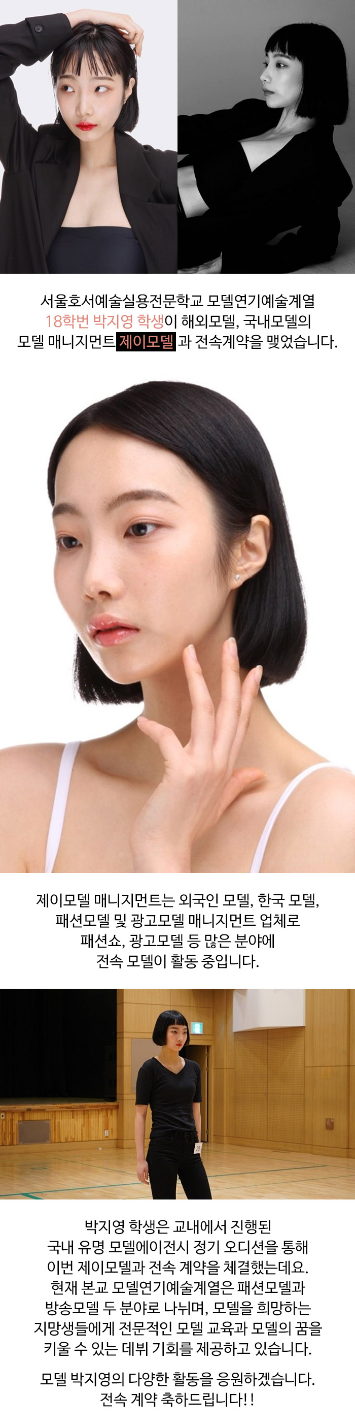 서울호서예술실용전문학교 모델연기예술계열 18학번 박지영 학생이 해외모델, 국내모델의 모델 매니지먼트 제이모델과 전속계약을 맺었습니다.