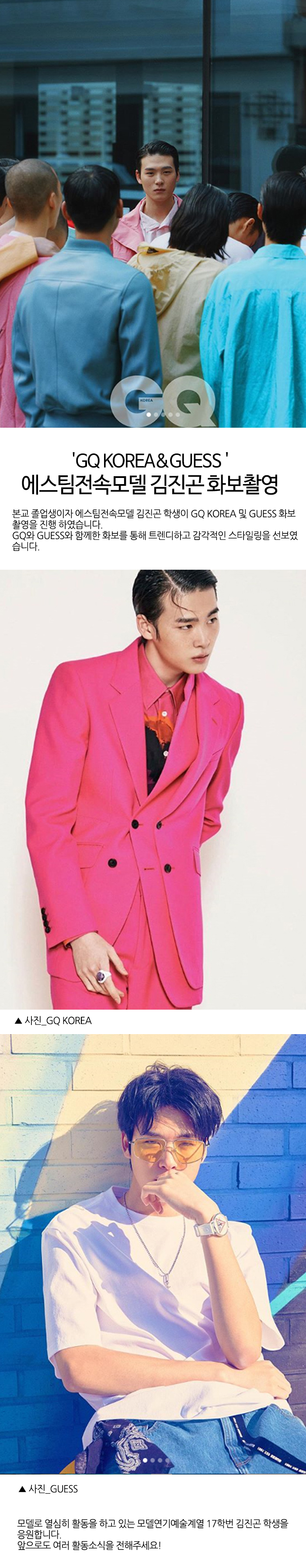 모델연기예술계열17학번 졸업생 김진곤(에스팀 전속모델) 학생이 GQ KOREA, GUESS 화보촬영을 하였습니다.