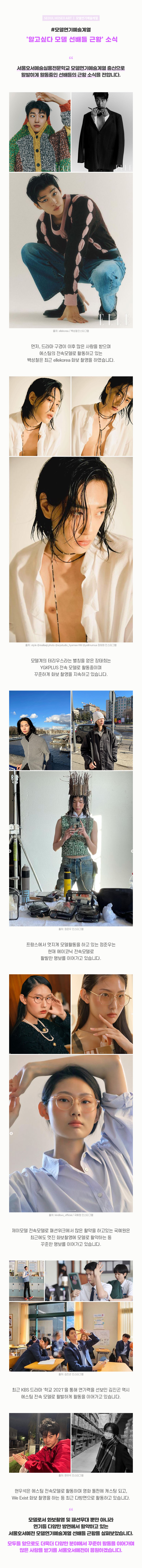 모델연기예술계열 '알고싶다 모델 선배들 근황' 소식 서울호서예술실용전문학교 모델연기예술계열 출신으로 활발하게 활동중인 선배들의 근황 소식을 전합니다. 먼저, 드라마 구경이 이후 많은 사랑을 받으며 에스팀의 전속모델로 활동하고 있는 백성철은 최근 ellekorea 화보 촬영을 하였습니다.