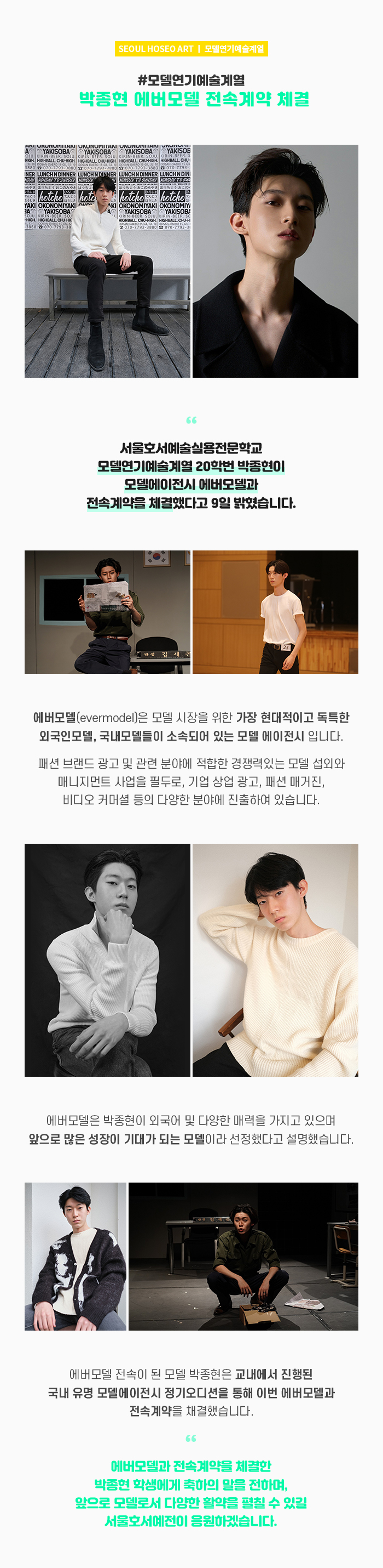 서울호서예술실용전문학교 모델연기예술계열 20학번 박종현이 모델에이전시 에버모델과 전속계약을 체결했다고 9일 밝혔습니다. 에버모델 (evermodel)은 모델 시장을 위한 가장 현대적이고 독특한 외국인모델, 국내모델들이 소속되어 있는 모델 에이전시 입니다.