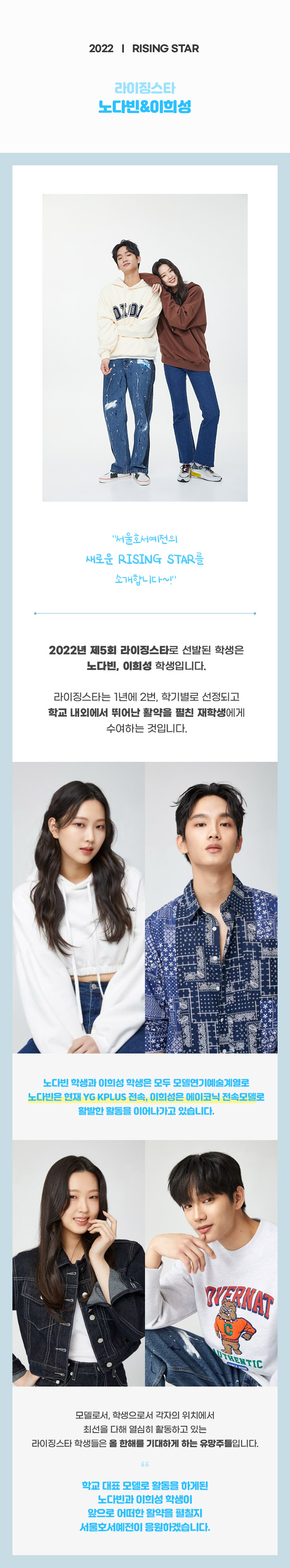 서울호서예술실용전문학교의 새로운 RISING STAR를 소개합니다. 2022년 제5회 라이징스타로 선발된 학생은 노다빈, 이희성 학생입니다. 라이징스타는 1년에 2번, 학기별로 선정되고 학교 내외에서 뛰어난 활약을 펼친 재학생에게 수여하는 것입니다.