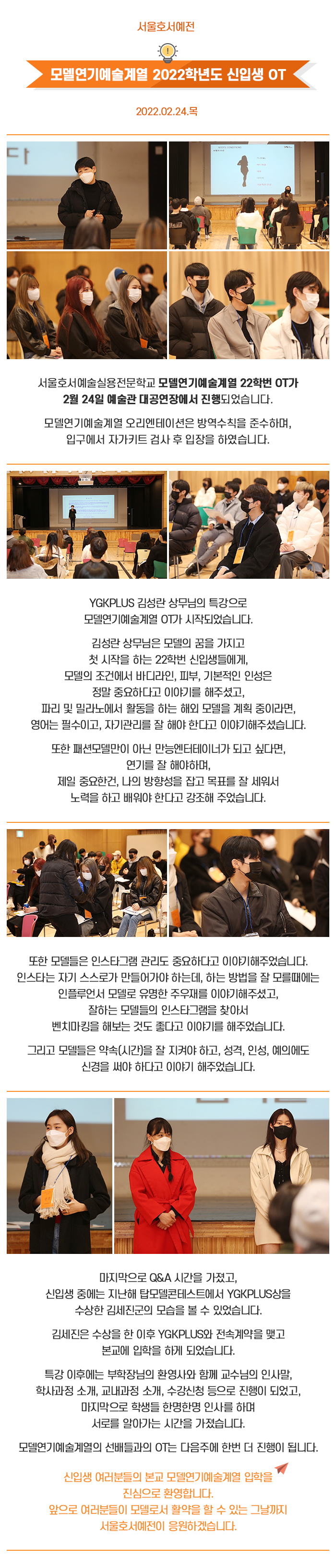 서울호서예술실용전문학교 모델연기예술계열 22학번 OT가 2월 24일 예술관 대공연장에서 진행되었습니다. 모델연기예술계열 오리엔테이션은 방역수칙을 준수하며, 입구에서 자가키트 검사 후 입장을 하였습니다. YGKPLUS 김성란 상무님의 특강으로 모델연기예술계열 OT가 시작되었습니다.