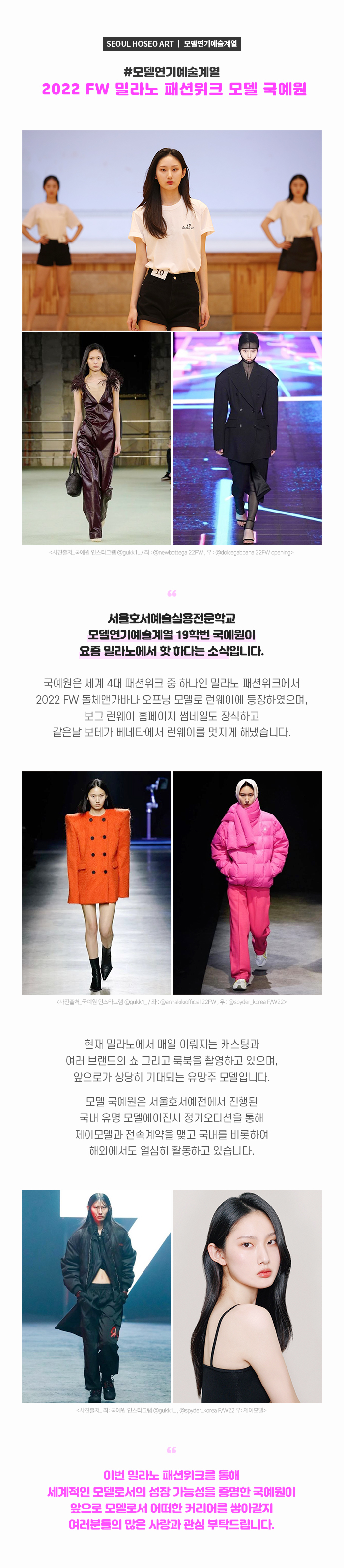서울호서예술실용전문학교 모델연기예술계열 19학번 국예원이 요즘 밀라노에서 핫 하다는 소식입니다. 국예원은 세계 4대 패션위크 중 하나인 밀라노 패션위크에서 2022 FW 돌체앤가바나 오프닝 모델로 런웨이에 등장하였으며, 보그 런웨이 홈페이지 썸네일도 장식하고 같은날 보테가 베네타에서 런웨이를 멋지게 해냈습니다. 현재 밀라노에서 매일 이뤄지는 캐스팅과 여러 브랜드의 쇼 그리고 룩북을 촬영하고 있으며, 앞으로가 상당히 기대되는 유망주 모델입니다. 모델 국예원은 서울호서예전에서 진행된 국내 유명 모델에이전시 정기오디션을 통해 제이모델과 전속계약을 맺고 국내를 비롯하여 해외에서도 열심히 활동하고 있습니다.