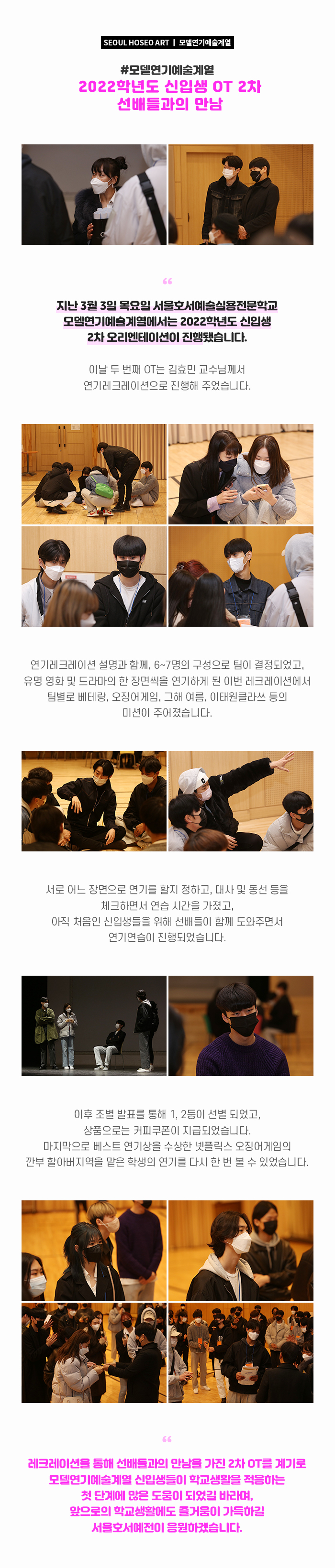 지난 3월 3일 목요일 서울호서예술실용전문학교 모델연기예술계열에서는 2022학년도 신입생 2차 오리엔테이션이 진행되습니다. 이날 두 번째 OT는 김효민 교수님께서 연기레크레이션으로 진행해 주었습니다. 연기레크레이션 설명과 함께, 6~7명의 구성으로 팀이 결정되었고, 유명 영화 및 드라마의 한 장면씩을 연기하게 된 이번 레크레이션에서 팀별로 베테랑, 오징어게임, 그해 여름, 이태원클라쓰 등의 미션이 주어졌습니다.