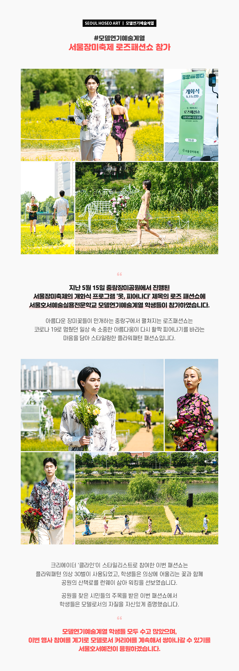 지난 5월 15일 중랑장미공원에서 진행된 서울장미축제의 개화식 프로그램 '옷, 피어나다' 제목의 로즈 패션쇼에 서울호서예술실용전문학교 모델연기예술계열 학생들이 참가하였습니다. 아름다운 장미꽃들이 만개하는 중랑구에서 펼쳐지는 로즈패션쇼는 코로나 19로 멈췄던 일상 속 소중한 아름다움이 다시 활짝 피어나기를 바라는 마음을 담아 스타일링한 플라워패턴 패션쇼입니다.