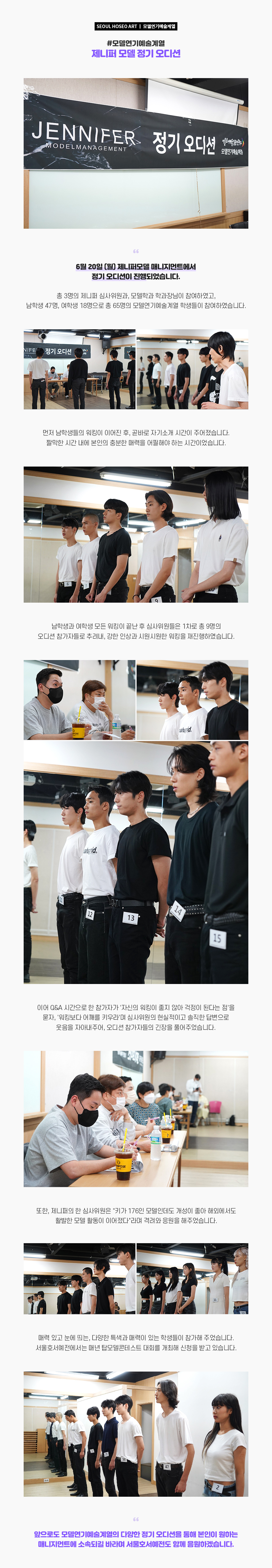 6월 20일 (월) 제니퍼모델 매니지먼트에서 정기 오디션이 진행되었습니다. 총 3명의 제니퍼 심사위원과, 모델학과 학과장님이 참여하였고, 남학생 47명, 여학생 18명으로 총 65명의 모델연기예술계열 학생들이 참여하였습니다.