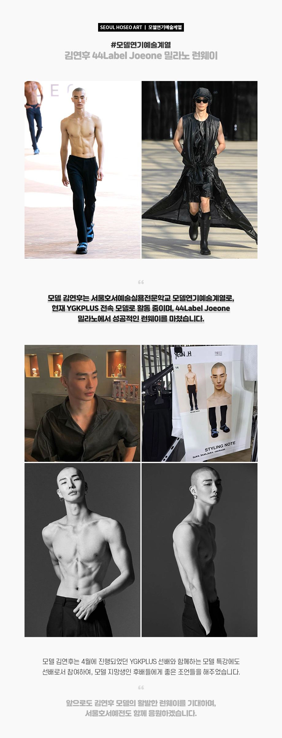 모델 김연후는 서울호서예술실용전문학교 모델연기예술계열로, 현재 YGKPLUS 전속 모델로 활동 중이며, 44Label Joeone 밀라노에서 성공적인 런웨이를 마쳤습니다.