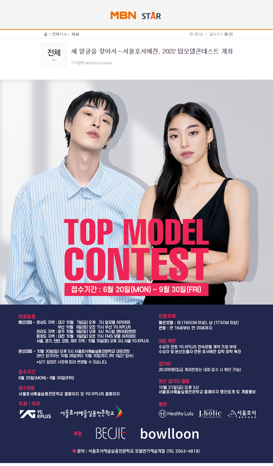 탑모델콘테스트는 만 16세부터 20세까지 모델을 희망하는 학생들을 위한 모델 선발대회로 수상자 전원 YG케이플러스 전속모델 계약 기회가 부여되며, 서울호서예전 입학 장학 특전이 주어진다.