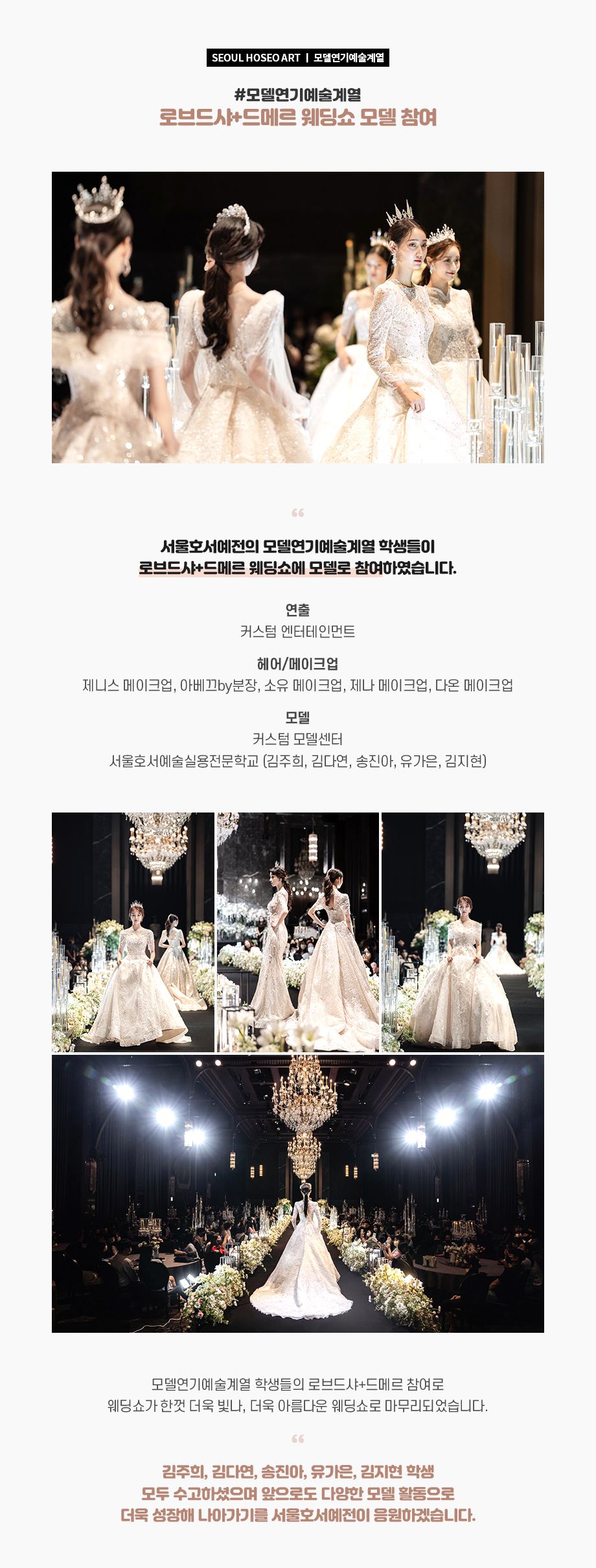 서울호서예전의 모델연기예술계열 학생들이 로브드샤+드메르 웨딩쇼에 모델로 참여하였습니다. 모델연기예술계열 학생들의 로브드샤+드메르 참여로 웨딩쇼가 한껏 더욱 빛나, 더욱 아름다운 웨딩쇼로 마무리되었습니다.
