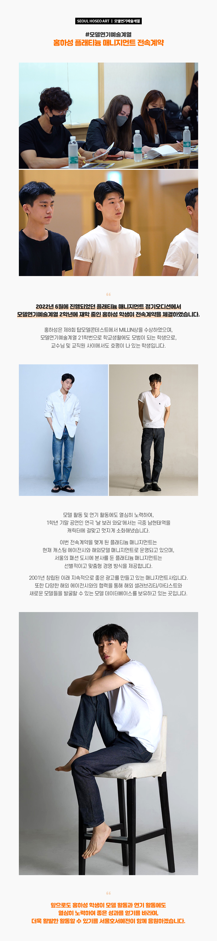 2022년 6월에 진행되었던 플래티늄 매니지먼트 정기오디션에서 모델연기예술계열 2학년에 재학 중인 홍하성 학생이 전속계약을 체결하였습니다. 홍하성은 제8회 탑모델콘테스트에서 MILLIN상을 수상하였으며, 모델연기예술계열 21학번으로 학교생활에도 모범이 되는 학생으로, 교수님 및 교직원 사이에서도 호평이 나 있는 학생입니다.