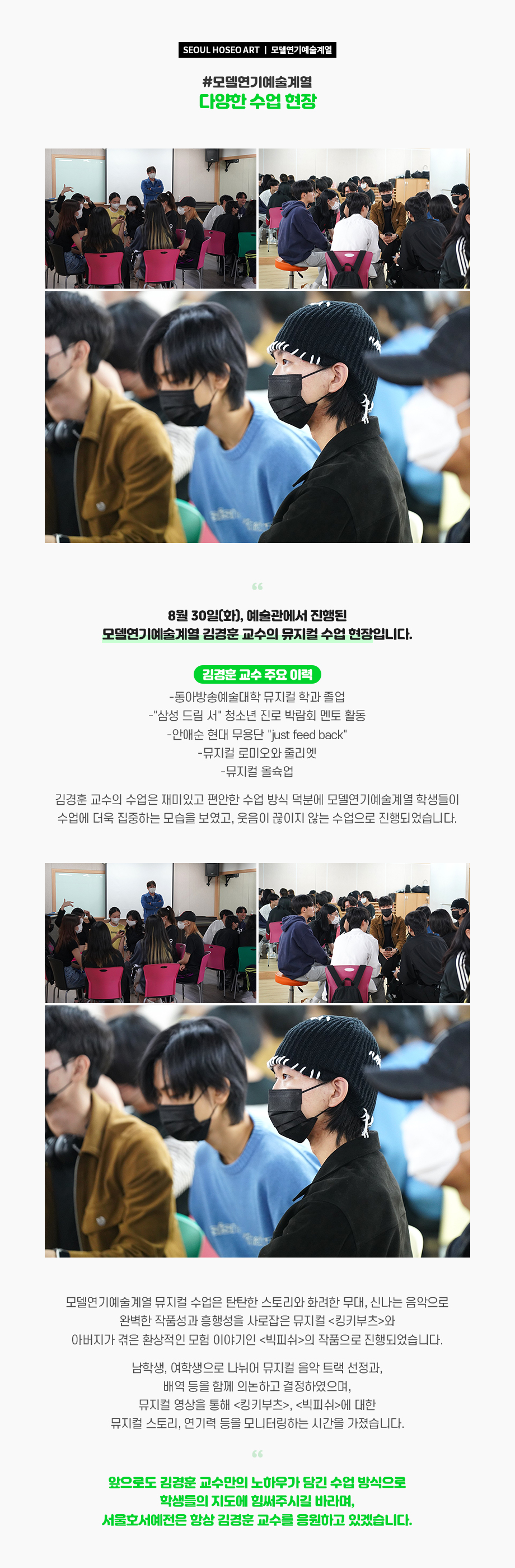 8월 30일(화), 예술관에서 진행된 모델연기예술계열 김경훈 교수의 뮤지컬 수업 현장입니다. 김경훈 교수의 수업은 재미있고 편안한 수업 방식 덕분에 모델연기예술계열 학생들이 수업에 더욱 집중하는 모습을 보였고, 웃음이 끊이지 않는 수업으로 진행되었습니다.