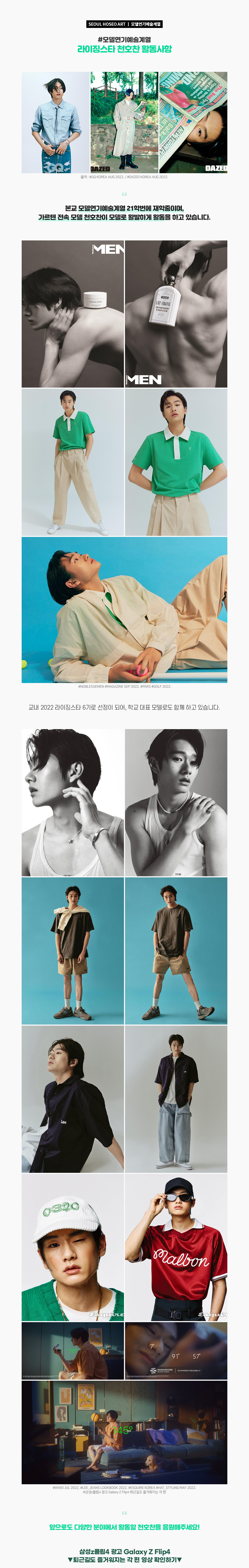 본교 모델연기예술계열 21학번에 재학중이며, 가르텐 전속 모델 천호찬이 모델로 활발하게 활동을 하고 있습니다. 교내 2022 라이징스타 6기로 선정이 되어, 학교 대표 모델로도 함께 하고 있습니다.