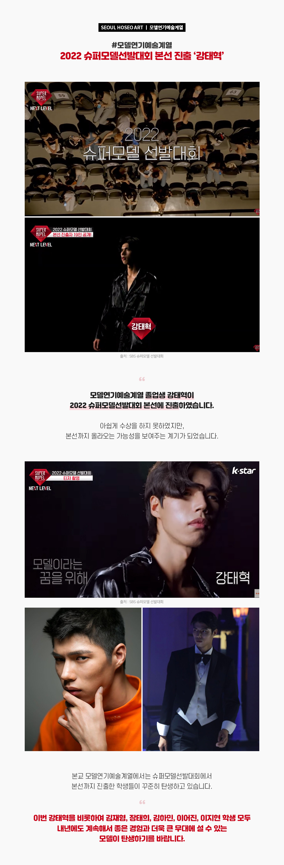 모델연기예술계열 졸업생 강태혁이 2022 슈퍼모델선발대회 본선에 진출하였습니다. 아쉽게 수상을 하지 못하였지만, 본선까지 올라오는 가능성을 보여주는 계기가 되었습니다. 본교 모델연기예술계열에서는 슈퍼모델선발대회에서 본선까지 진출한 학생들이 꾸준히 탄생하고 있습니다.