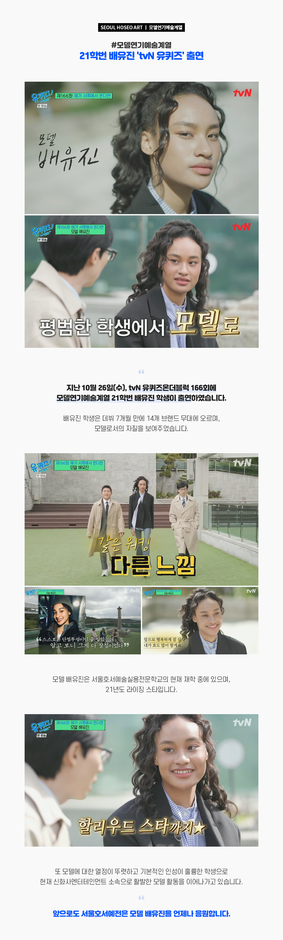 지난 10월 26일(수), tvN 유퀴즈온더블럭 166회에 모델연기예술계열 21학번 배유진 학생이 출연하였습니다. 배유진 학생은 데뷔 7개월 만에 14개 브랜드 무대에 오르며, 모델로서의 자질을 보여주었습니다.