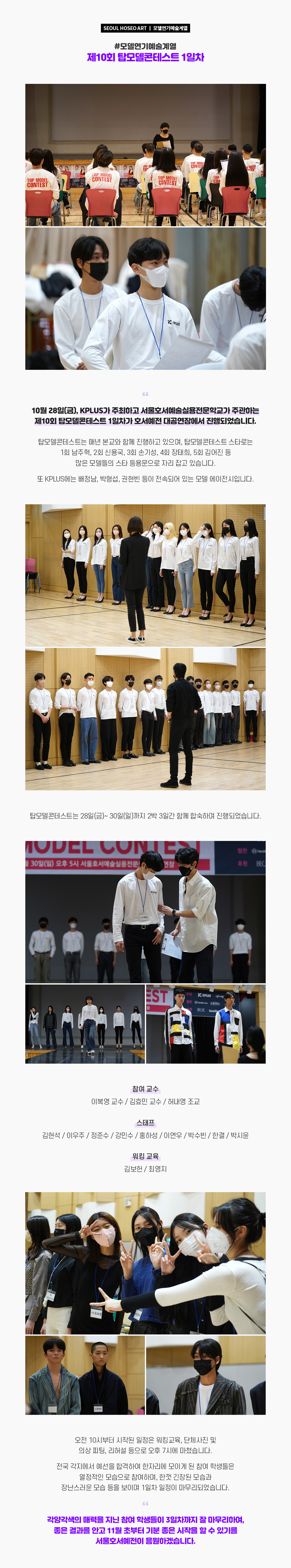 10월 28일(금), KPLUS가 주최하고 서울호서예술실용전문학교가 주관하는 제10회 탑모델콘테스트 1일차가 호서예전 대공연장에서 진행되었습니다. 탑모델콘테스트는 매년 본교와 함께 진행하고 있으며, 탑모델콘테스트 스타로는 1회 남주혁, 2회 신용국, 3회 손기성, 4회 장태희, 5회 김어진 등 많은 모델들의 스타 등용문으로 자리 잡고 있습니다. 또 KPLUS에는 배정남, 박형섭, 권현빈 등이 전속되어 있는 모델 에이전시입니다.