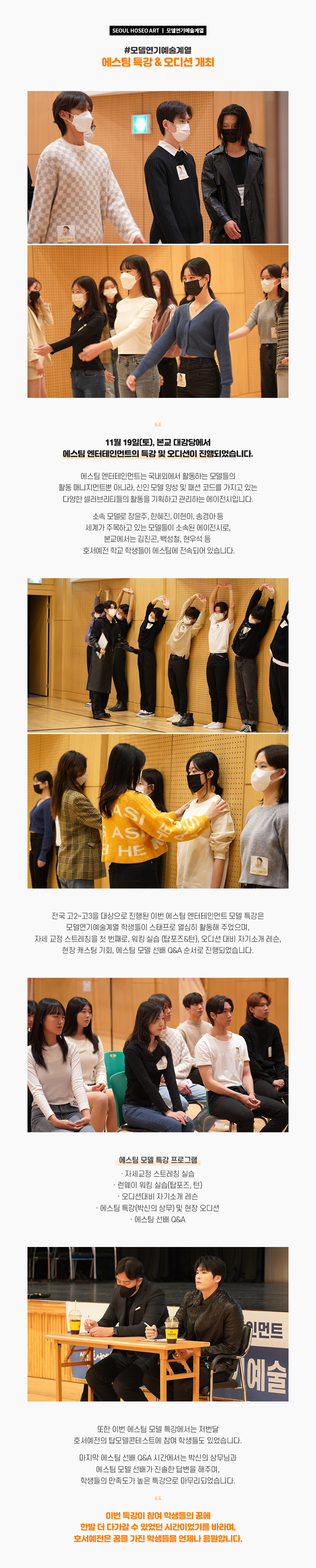 11월 19일(토), 본교 대강당에서 에스팀 엔터테인먼트의 특강 및 오디션이 진행되었습니다. 에스팀 엔터테인먼트는 국내외에서 활동하는 모델들의 활동 매니지먼트뿐 아니라, 신인 모델 양성 및 패션 코드를 가지고 있는 다양한 셀러브리티들의 활동을 기획하고 관리하는 에이전시입니다. 소속 모델로 장윤주, 한혜진, 이현이, 송경아 등 세계가 주목하고 있는 모델들이 소속된 에이전시로, 본교에서는 김진곤, 백성철, 현우석 등 호서예전 학교 학생들이 에스팀에 전속되어 있습니다.