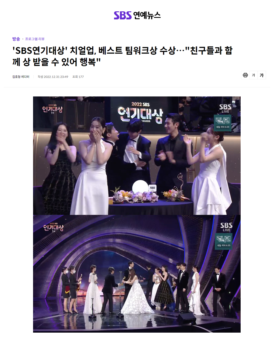 [언론보도] 'SBS연기대상' 치얼업, 베스트 팀워크상 수상…"친구들과 함께 상 받을 수 있어 행복"