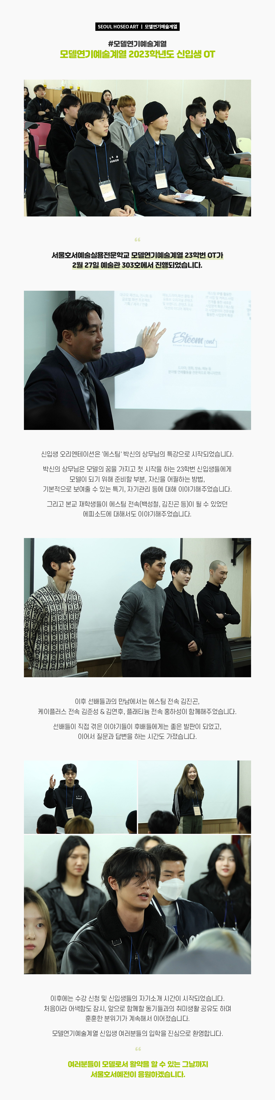 서울호서예술실용전문학교 모델연기예술계열 23학번 OT가 2월 27일 예술관 303호에서 진행되었습니다. 신입생 오리엔테이션은 '에스팀' 박신의 상무님의 특강으로 시작되었습니다. 박신의 상무님은 모델의 꿈을 가지고 첫 시작을 하는 23학번 신입생들에게 모델이 되기 위해 준비할 부분, 자신을 어필하는 방법, 기본적으로 보여줄 수 있는 특기, 자기관리 등에 대해 이야기해주었습니다. 그리고 본교 재학생들이 에스팀 전속(백성철, 김진공 등)이 될 수 있었던 에피소드에 대해서도 이야기해주었습니다.
