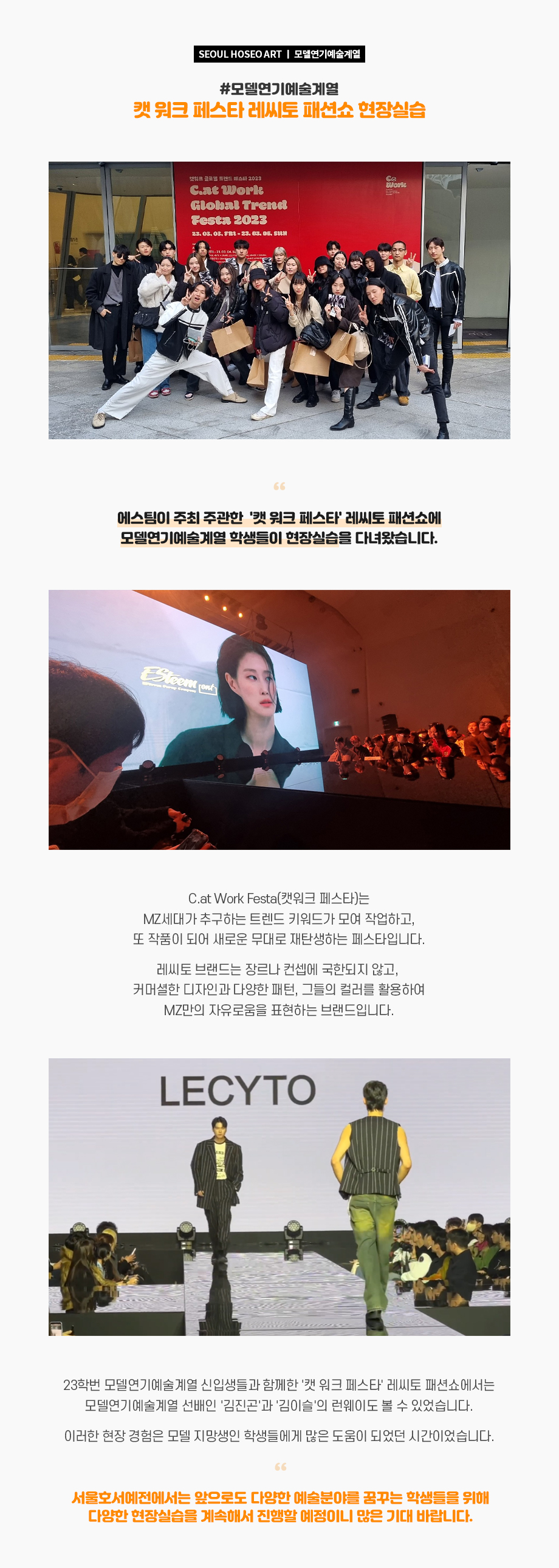 에스팀이 주최 주관한 '캣 워크 페스타' 레씨토 패션쇼에 모델연기예술계열 학생들이 현장실습을 다녀왔습니다. C.at Work Festa(캣워크 페스타)는 MZ세대가 추구하는 트렌드 키워드가 모여 작업하고, 또 작품이 되어 새로운 무대로 재탄생하는 페스타입니다.
