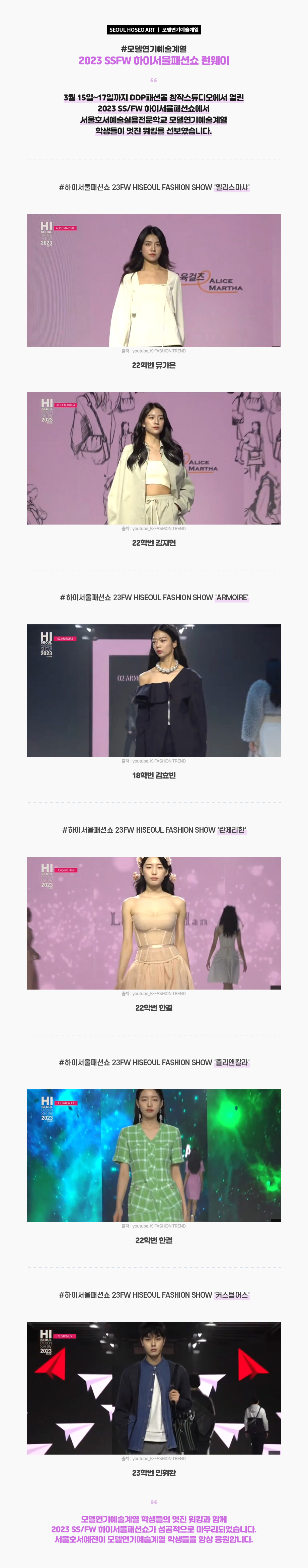 3월 15일~17일까지 DDP패션몰 창작스튜디오에서 열린 2023 SS/FW 하이서울패션쇼에서 서울호서예술실용전문학교 모델연기예술계열 학생들이 멋진 워킹을 선보였습니다.