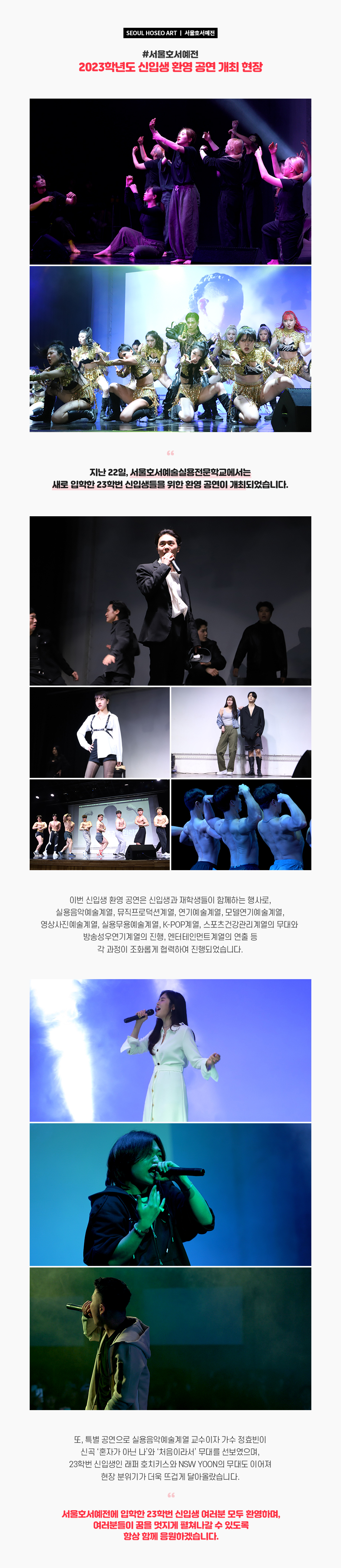 지난 22일, 서울호서예술실용전문학교에서는 새로 입학한 23학번 신입생들을 위한 환영 공연이 개최되었습니다. 이번 신입생 환영 공연은 신입생과 재학생들이 함께하는 행사로, 실용음악예술계열, 뮤직프로덕션계열, 연기예술계열, 모델연기예술계열, 영상사진예술계열, 실용무용예술계열, K-POP계열, 스포츠건강관리계열의 무대와 방송성우연기계열의 진행, 엔터테인먼트계열의 연출 등 각 과정이 조화롭게 협력하여 진행되었습니다.