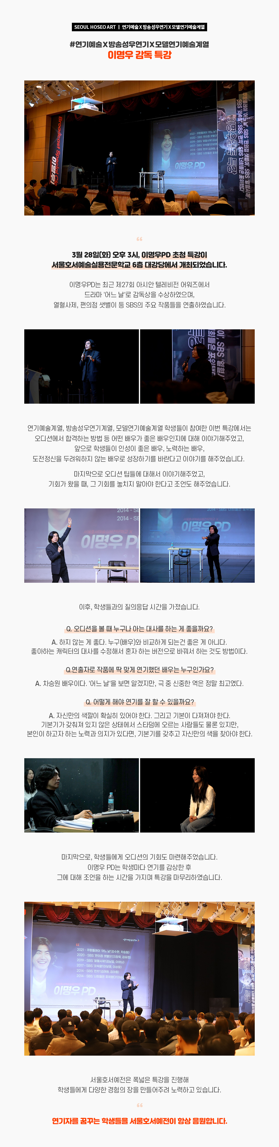 3월 28일(화) 오후 3시, 이명우PD 초청 특강이 서울호서예술실용전문학교 6층 대강당에서 개최되었습니다. 이명우PD는 최근 제27회 아시안 텔레비전 어워즈에서 드라마 '어느 날'로 감독상을 수상하였으며, 열혈사제, 편의점 샛별이 등 SBS의 주요 작품들을 연출하였습니다.