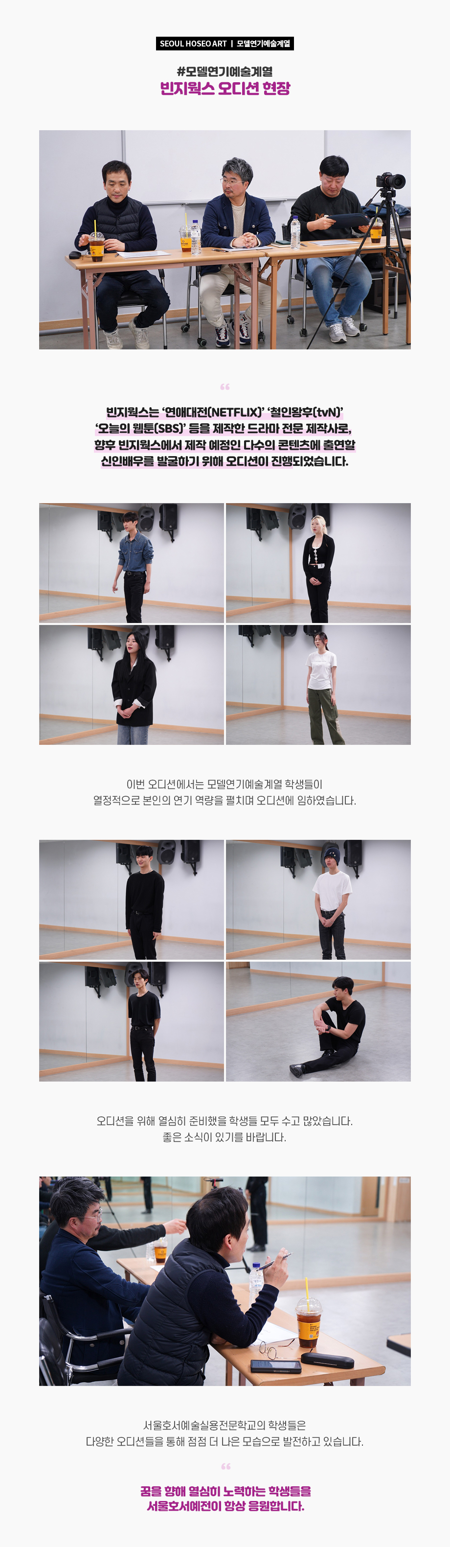 4월 14일, 서울호서예술실용전문학교에서 모델연기예술계열 학생들을 대상으로 한 빈지웍스 오디션이 진행되었습니다. 빈지웍스는 ‘연애대전(NETFLIX)’ ‘철인왕후(tvN)’ ‘오늘의 웹툰(SBS)’ 등을 제작한 드라마 전문 제작사로, 향후 빈지웍스에서 제작 예정인 다수의 콘텐츠에 출연할 신인배우를 발굴하기 위해 오디션이 진행되었습니다.
