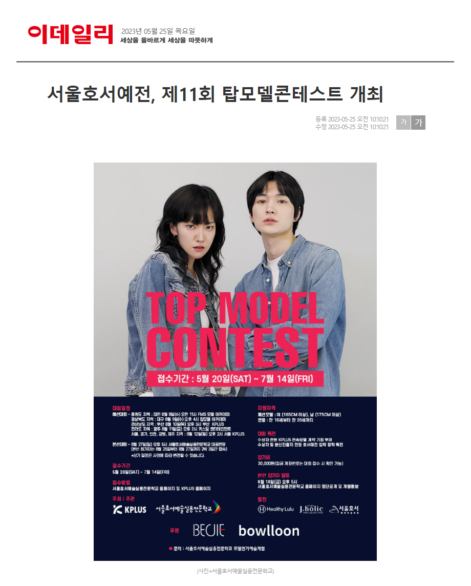 2023 제11회 탑 모델 콘테스트는 백지애웨딩(BECJIE), 보울룬(bowlloon)이 후원하고, 헬씨룰루, 제이홀릭 헤어&메이크업, 서울호서메이크업이 협찬한다. 대회접수는 오는 7월 14일까지 서울호서예술실용전문학교 모델연기예술계열 홈페이지에서 가능하다.