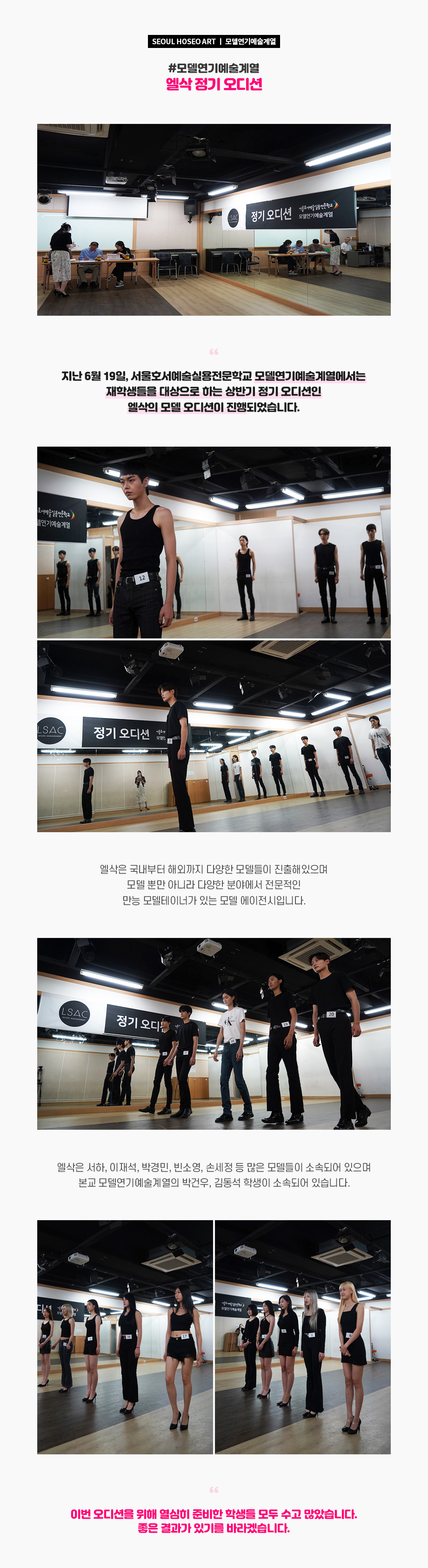 지난 6월 19일, 서울호서예술실용전문학교 모델연기예술계열에서는 재학생들을 대상으로 하는 상반기 정기 오디션인 엘삭의 모델 오디션이 진행되었습니다. 엘삭은 국내부터 해외까지 다양한 모델들이 진출해있으며 모델 뿐만 아니라 다양한 분야에서 전문적인 만능 모델테이너가 있는 모델 에이전시입니다.