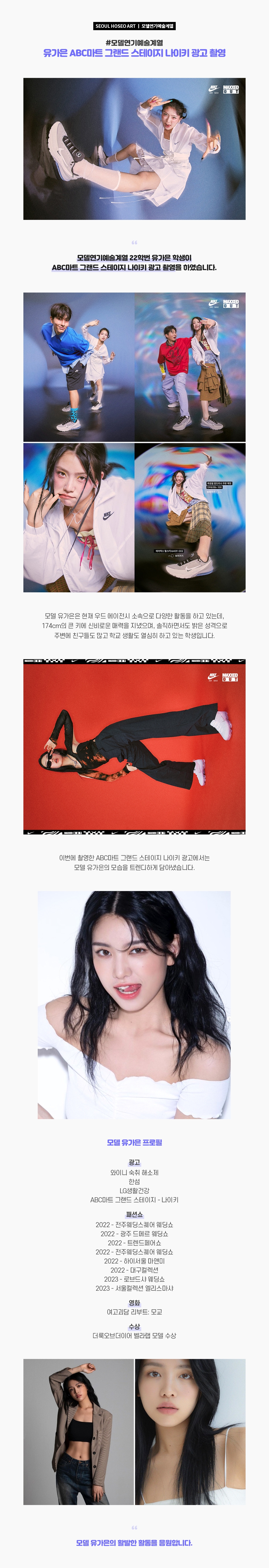모델연기예술계열 22학번 유가은 학생이 ABC마트 그랜드 스테이지 나이키 광고 촬영을 하였습니다. 모델 유가은은 현재 우드 에이전시 소속으로 다양한 활동을 하고 있는데, 174cm의 큰 키에 신비로운 매력을 지녔으며 솔직하면서도 밝은 성격으로 주변에 친구들도 많고 학교 생활도 열심히 하고 있는 학생입니다.