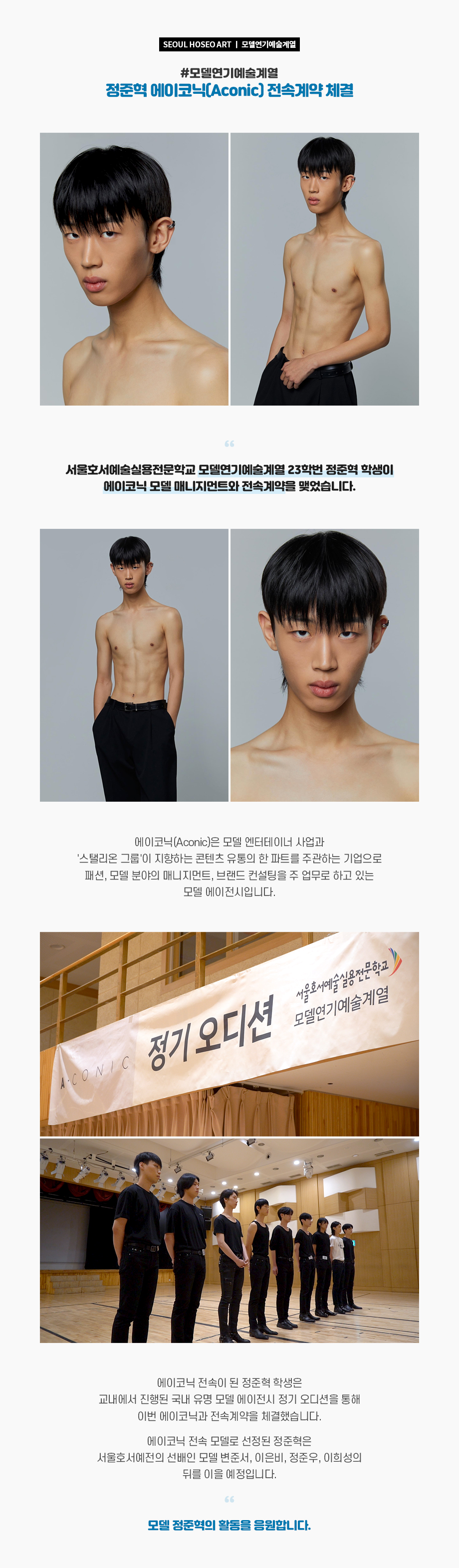 서울호서예술실용전문학교 모델연기예술계열 23학번 정준혁 학생이 에이코닉 모델 매니지먼트와 전속 계약을 맺었습니다. 에이코닉(Aconic)은 모델 엔터테이너 사업과 '스탤리온 그룹'이 지향하는 콘텐츠 유통의 한 파트를 주관하는 기업으로 패션, 모델 분야의 매니지먼트, 브랜드 컨설팅을 주 업무로 하고 있는 모델 에이전시입니다.