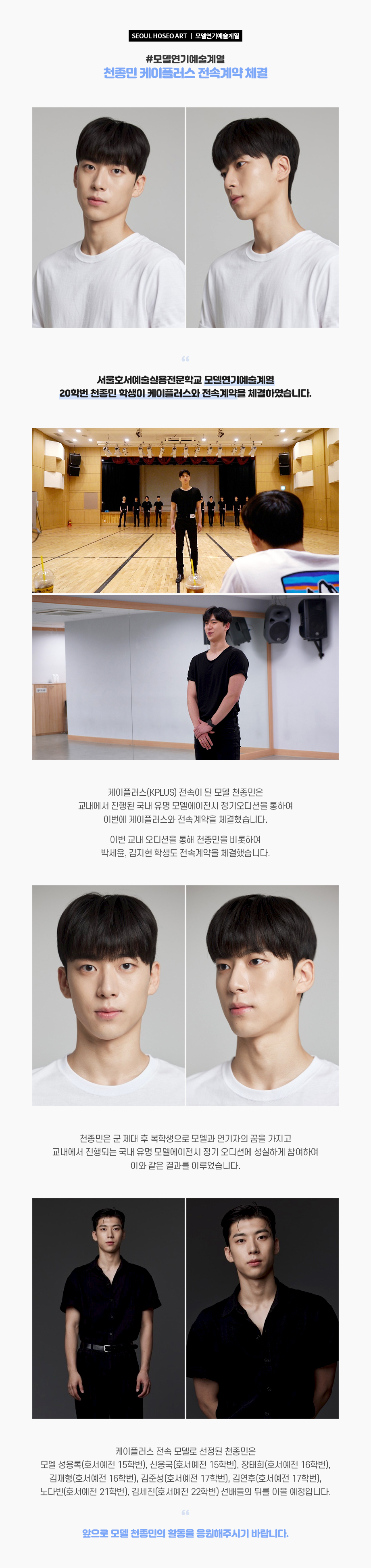 서울호서예술실용전문학교 모델연기예술계열 20학번 천종민 학생이 케이플러스와 전속계약을 체결하였습니다. 케이플러스(KPLUS)는 배윤영, 혜박, 박경진, 클로이 오, 김설희 등 모델들과 방송인 황보, 배우 유지애와 신지훈, 스포테이너 김하늘이 소속된 곳으로 아티스트들이 가진 재능을 여러 분야에서 펼칠 수 있도록 다양하게 지원하고 있습니다.