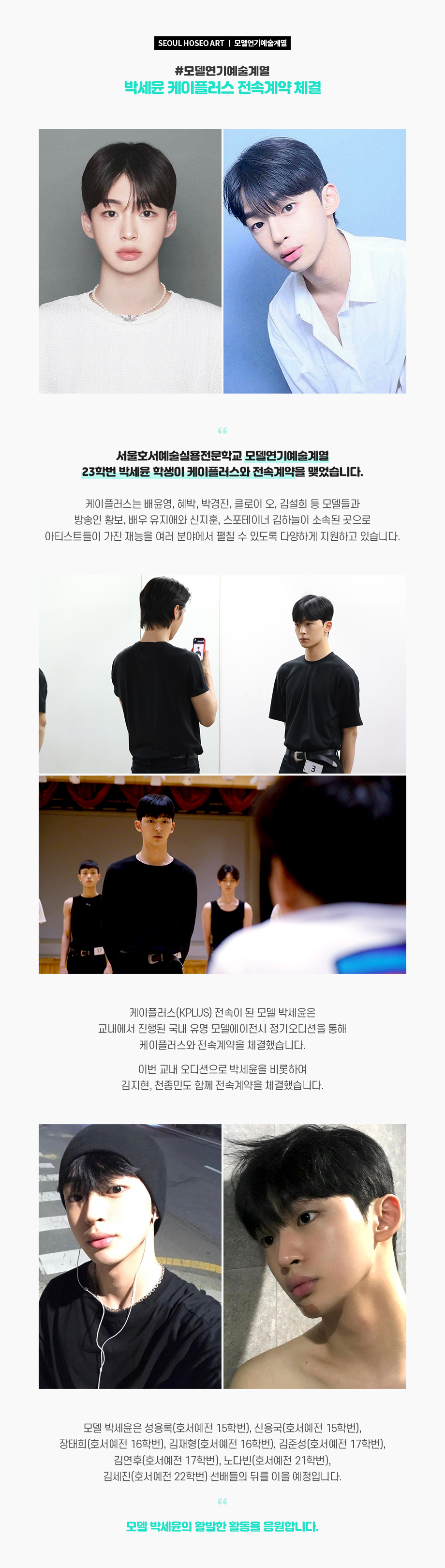 서울호서예술실용전문학교 모델연기예술계열 23학번 박세윤 학생이 케이플러스와 전속계약을 맺었습니다. 케이플러스(KPLUS)는 배윤영, 혜박, 박경진, 클로이 오, 김설희 등 모델들과 방송인 황보, 배우 유지애와 신지훈, 스포테이너 김하늘이 소속된 곳으로 아티스트들이 가진 재능을 여러 분야에서 펼칠 수 있도록 다양하게 지원하고 있습니다.