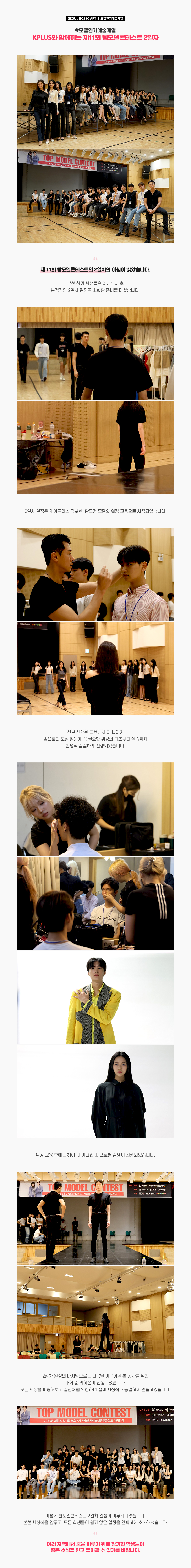 제 11회 탑모델콘테스트의 2일차의 아침이 밝았습니다. 본선 참가 학생들은 아침식사 후 본격적인 2일차 일정을 소화할 준비를 마쳤습니다. 2일차 일정은 케이플러스 김보헌, 황도경 모델의 워킹 교육으로 시작되었습니다.