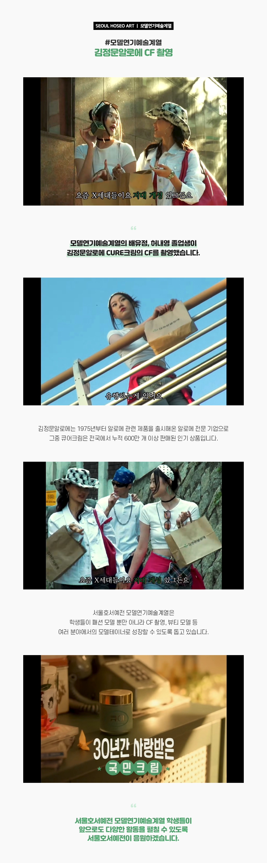 모델연기예술계열의 배유정, 허내영 졸업생이 김정문알로에 CURE크림의 CF를 촬영했습니다. 김정문알로에는 1975년부터 알로에 관련 제품을 출시해온 알로에 전문 기업으로 그중 큐어크림은 전국에서 누적 600만 개 이상 판매된 인기 상품입니다.
