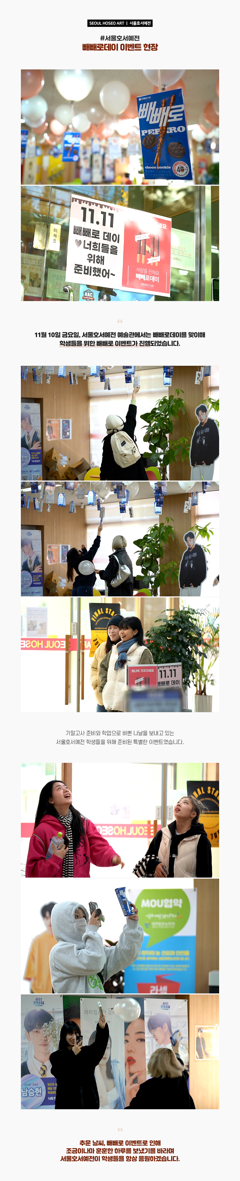 11월 10일 금요일, 서울호서예전 예술관에서는 빼빼로데이를 맞이해 학생들을 위한 빼빼로 이벤트가 진행되었습니다. 기말고사 준비와 학업으로 바쁜 나날을 보내고 있는 서울호서예전 학생들을 위해 준비된 특별한 이벤트였습니다.