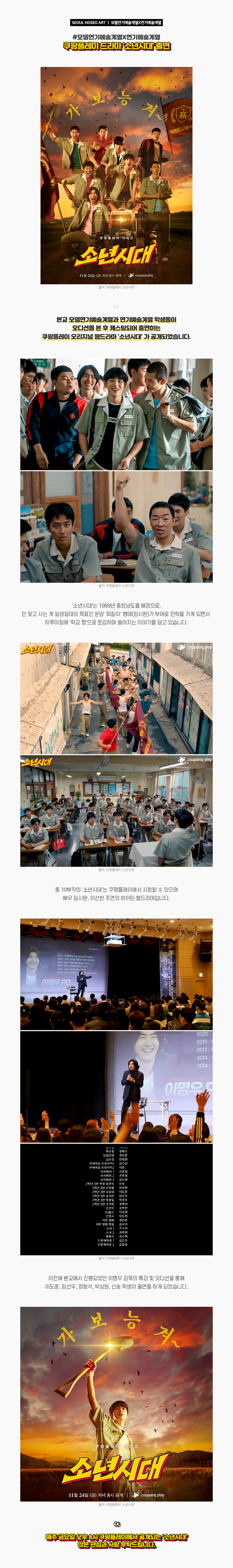 본교 모델연기예술계열과 연기예술계열 학생들이 오디션을 본 후 캐스팅되어 출연하는 쿠팡플레이 오리지널 웹드라마 '소년시대' 가 공개되었습니다. '소년시대'는 1989년 충청남도를 배경으로, 안 맞고 사는 게 일생일대의 목표인 온양 '찌질이' 병태(임시완)가 부여로 전학을 가게 되면서 하루아침에 '학교 짱'으로 둔갑하며 벌어지는 이야기를 담고 있습니다. 총 10부작의 '소년시대'는 쿠팡플레이에서 시청할 수 있으며 배우 임시완, 이선빈 주연의 하이틴 웹드라마입니다. 이전에 본교에서 진행되었던 이명우 감독의 특강 및 오디션을 통해 이도훈, 임선우, 정형석, 박상원, 신송 학생이 출연을 하게 되었습니다.